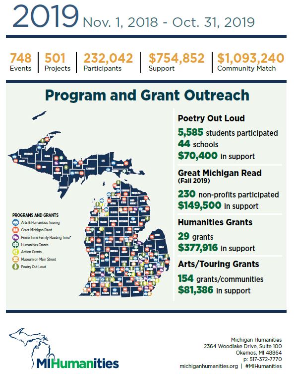 Michigan Humanities produces an Annual Report for print mail and web storage each spring. These reports cover our programming and funding actions of the previous fiscal year (November 1 through October 31). Follow the links below for samples of our previous Annual Reports.