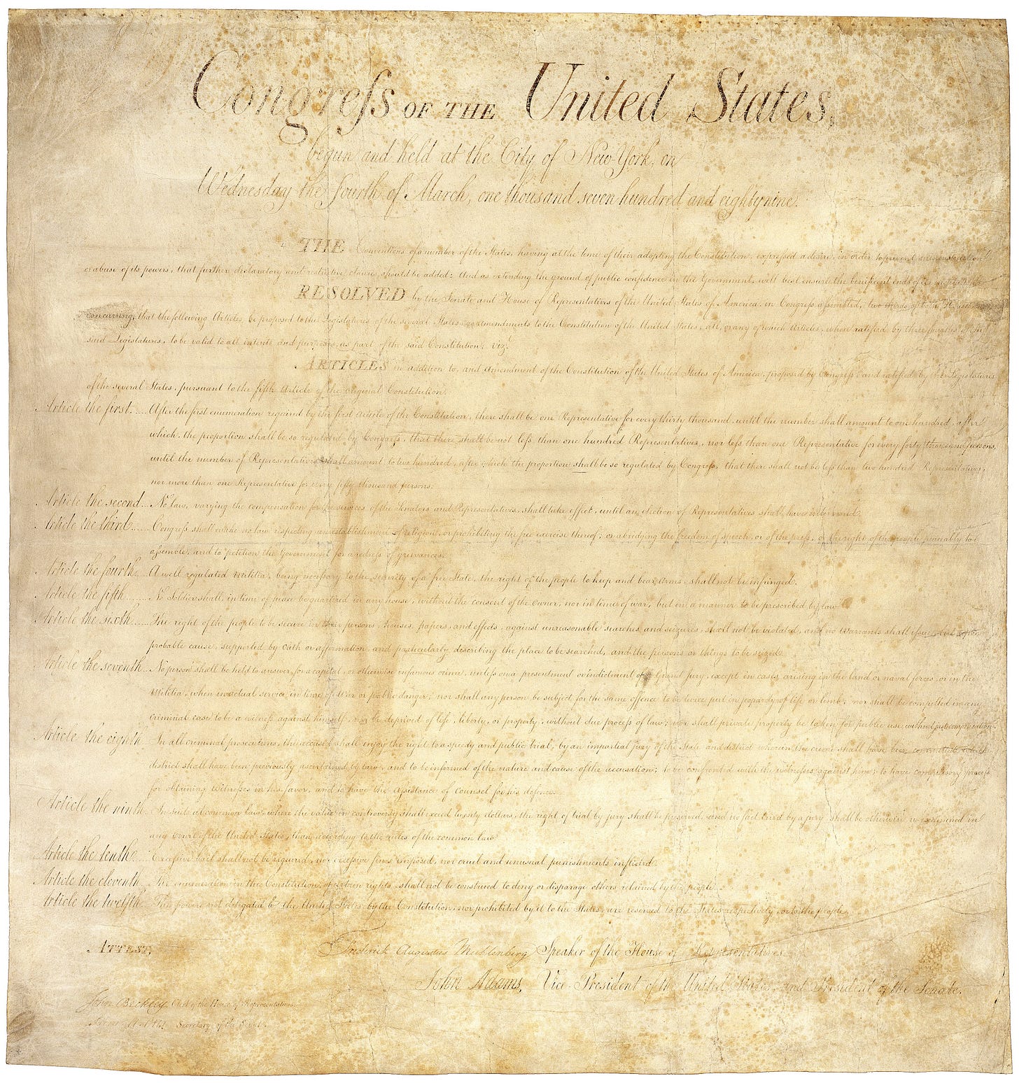 The Bill of Rights as approved by Congress on March 4, 1789. The states ratified ten of the twelve proposed amendments by 1791. The United States National Archives and Records Administration.